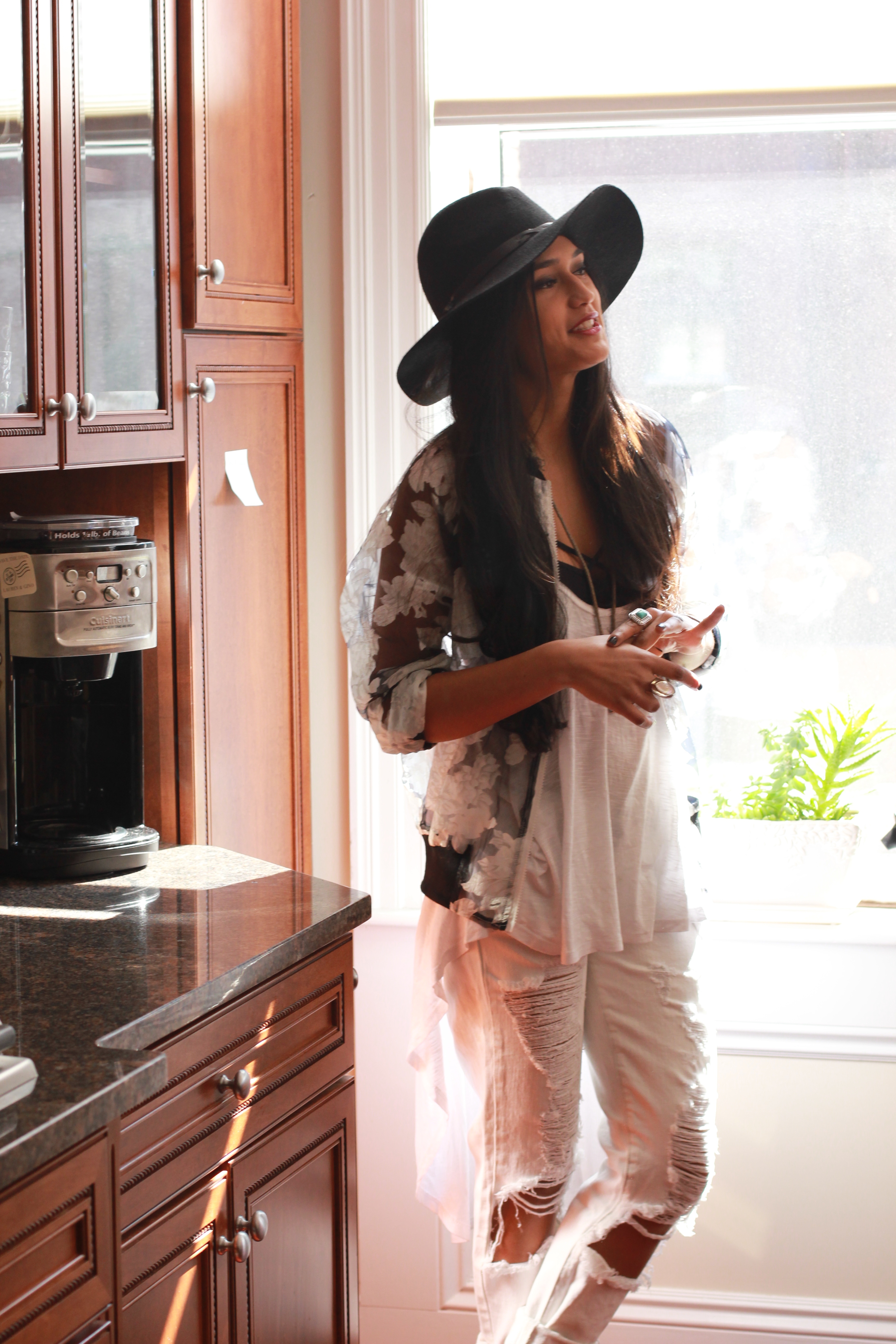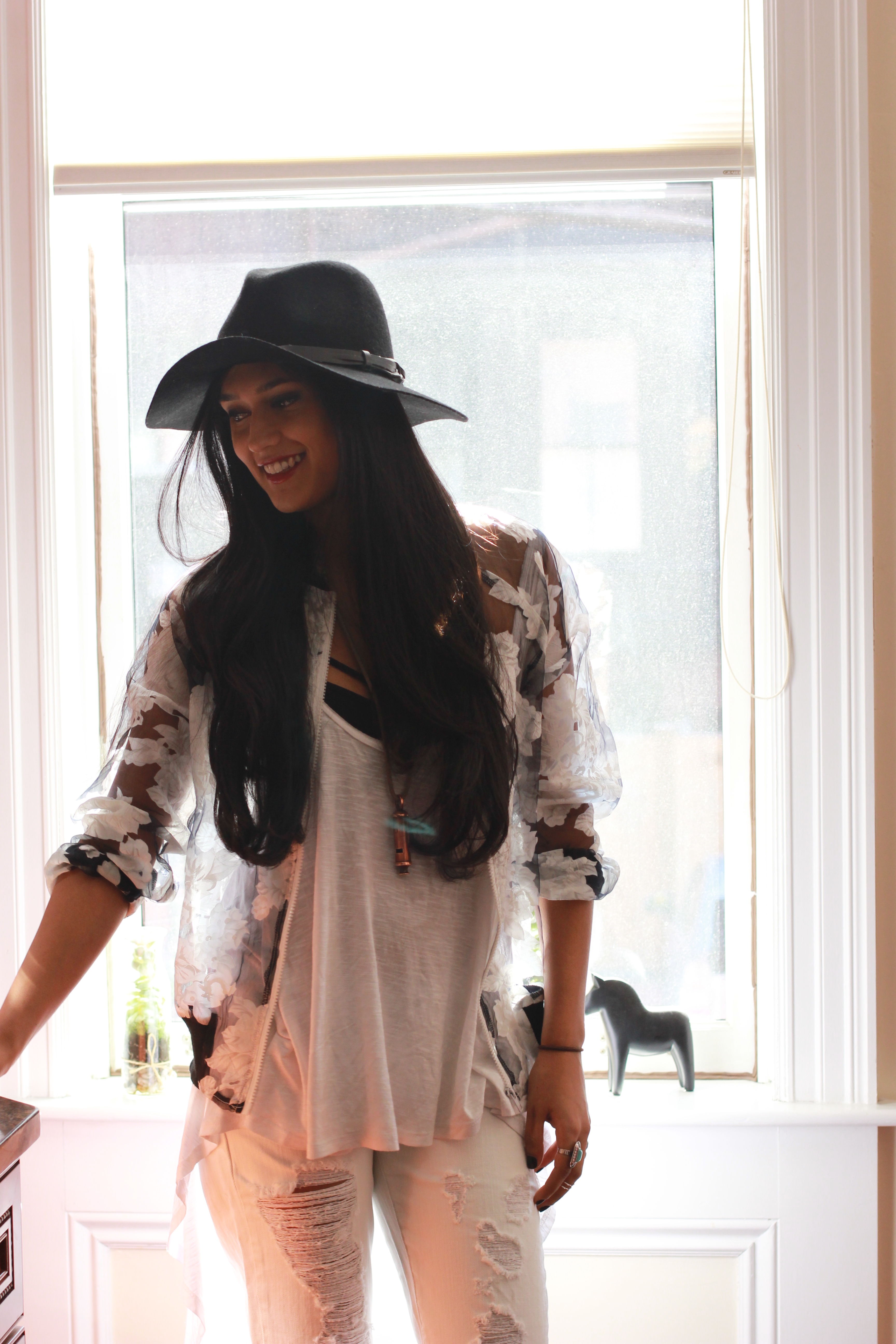“I like a mix of all different types of music which completely explains my style! I’ll take a little country music like Jason Aldean, and Tim MgGraw with that feel of going to a country concert wearing cowboy boots and a relaxed vibe. But then for example I am going to see Kings of Leon this weekend and I’ll be sporting a rock look with black wax leggings, a vintage ACDC T-shirt, my leather jacket with spikes, and black leather boots. I have a love for Indie Rock right now too like The XX, m83, and Lana Del Ray. This would explain the hippie side of my style like when I wear a flowery dress but I always add some rock and roll to my look.”