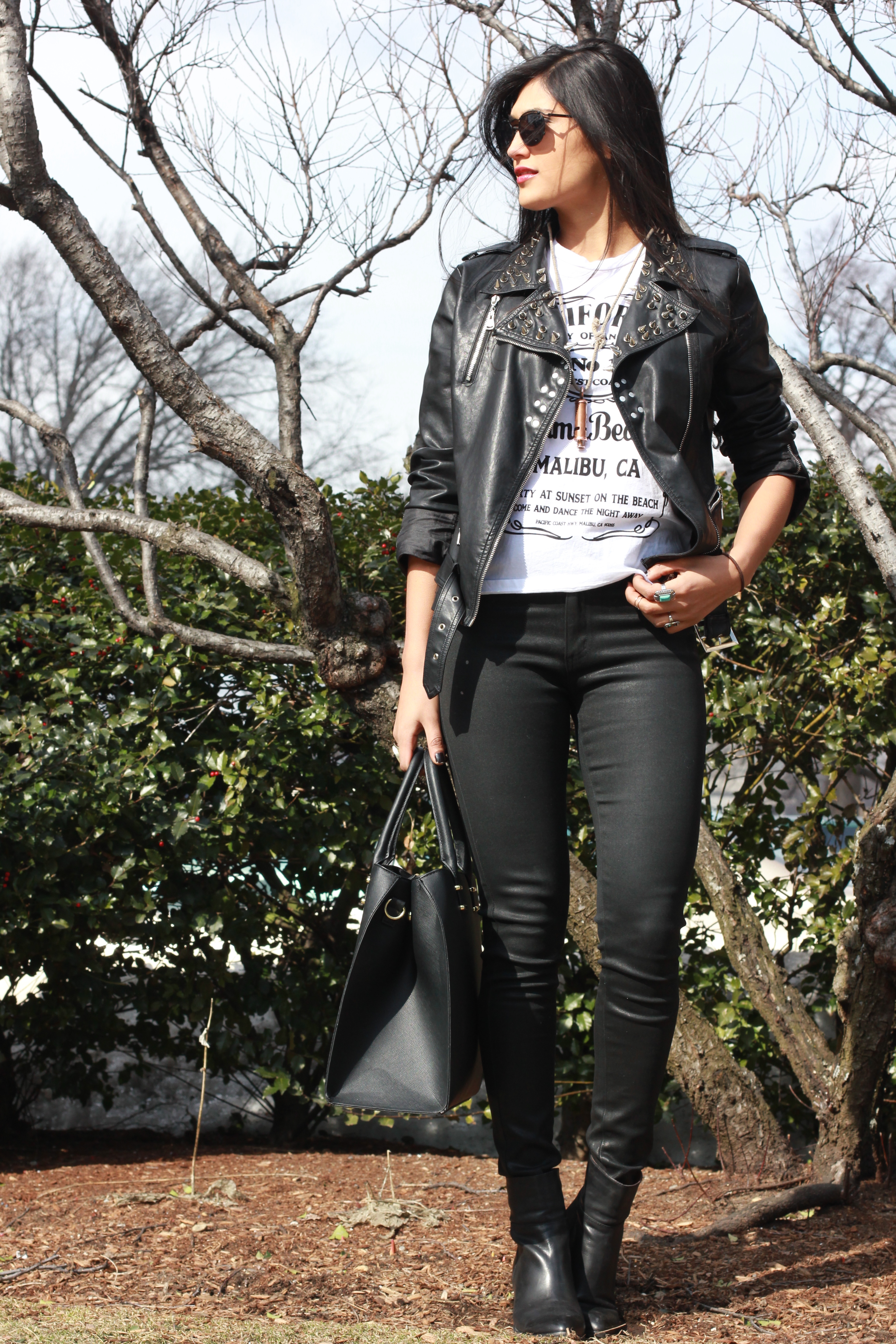 “Leather jacket (her jacket is by the designer, Kore), skinny jeans, booties, sun dress, a big fun purse, and some funky sunglasses.”